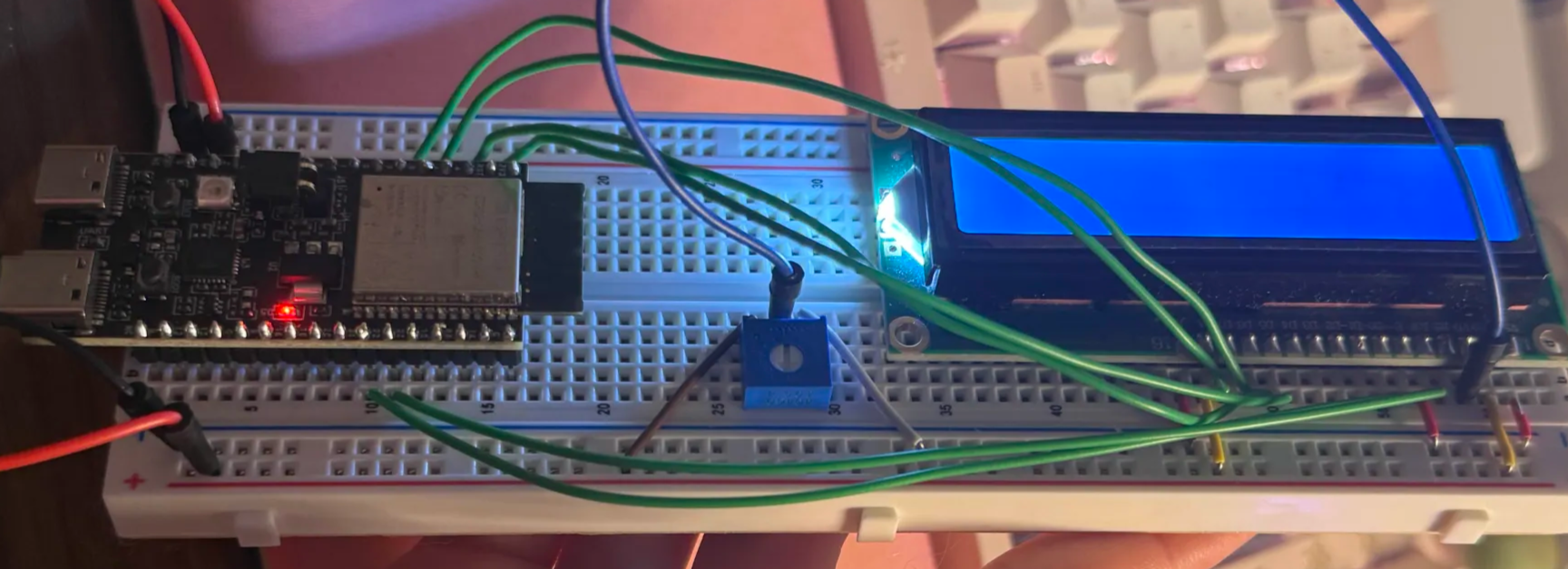 The LCD screen was breadboarded and initially tested with the ESP32. The